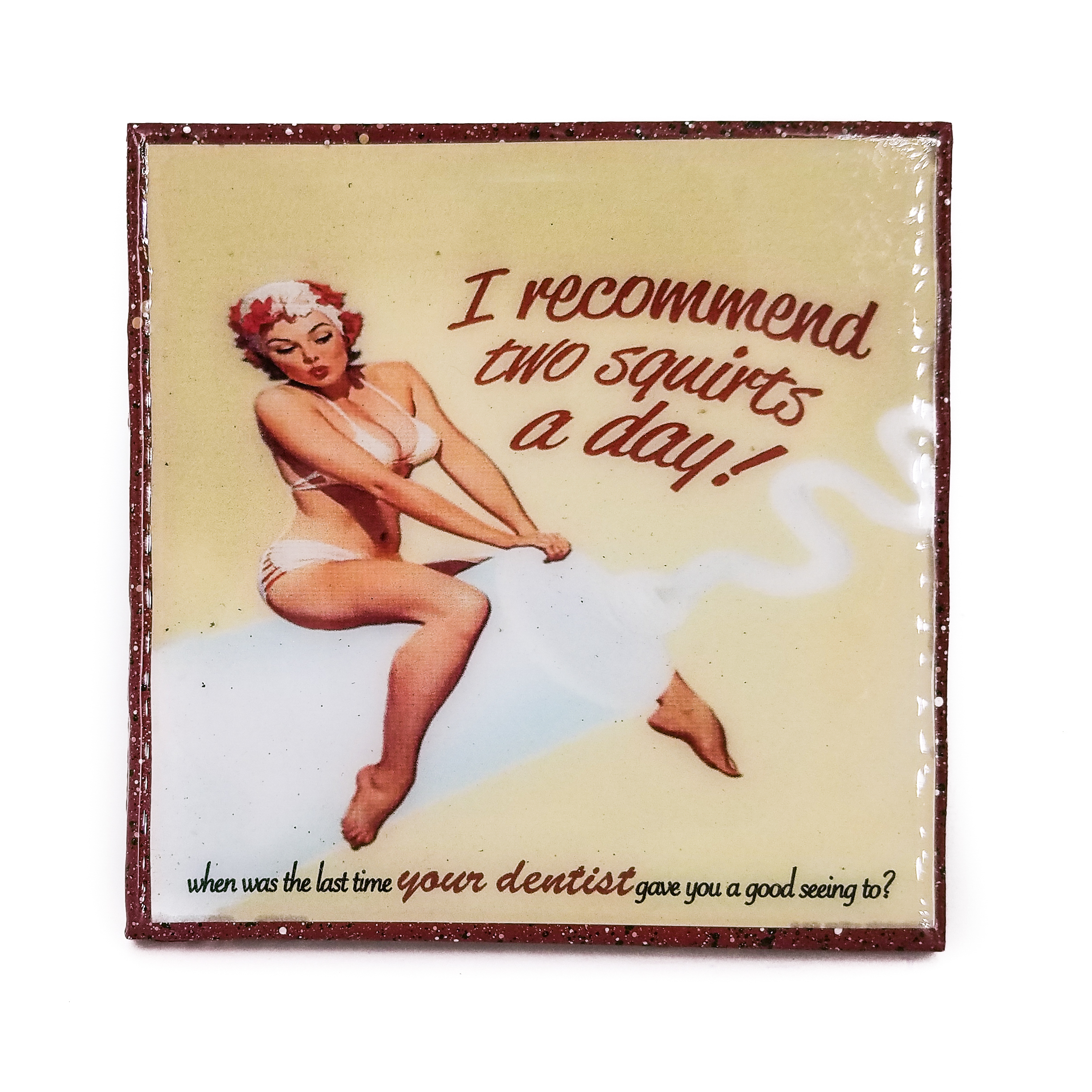 A Handmade Coaster Dentist girl pinup 2 squirts a day - Vintage Advertising, adorns this classy handcrafted coaster made with a handpainted upcycled tile.